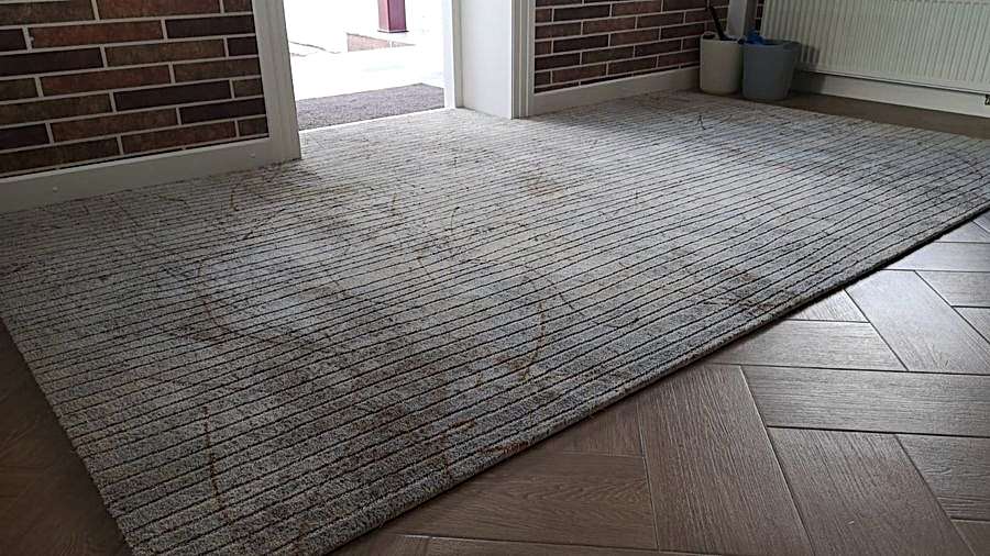 Ковер с дизайном вырезан по индивидуальном размеру из коврового покрытия на войлочной основе. Из небольшого Pin-Up сделал ковер в ванную комнату.